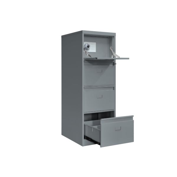 Standard vertical filing cabinets for file folders and documents, with a built-in fireproof safe compartment.