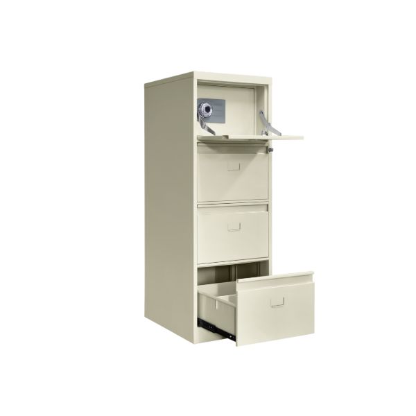 Standard vertical filing cabinets for file folders and documents, with a built-in fireproof safe compartment.